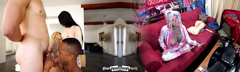 Bi dudes deepthroat each others dicks and fuck slutty blonde Candice Dare
