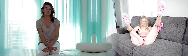 Blonde amateur Satine Spark takes off her shorts and plays on the sofa