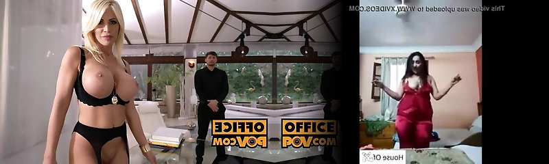 Huge-chested blonde woman in red, satin half-top, Sharon Pink got fucked from the back, while standing