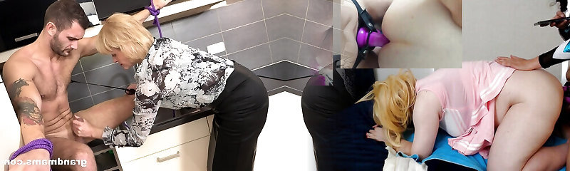 Lingerie-clad grandma with huge breasts getting her shaved pussy licked