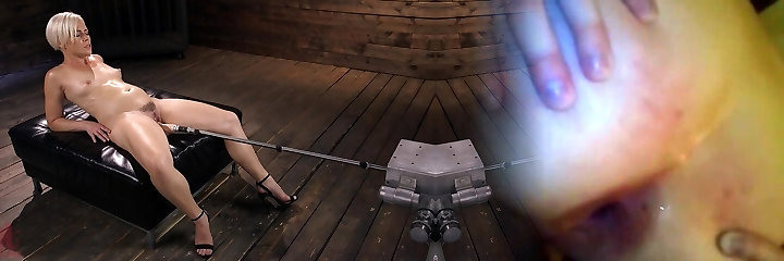 Oiled up solo fetish blond model Helena Locke torn up by a machine