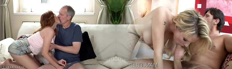 Two stunning lesbian girls swap their stepfathers for crazy foursome sex