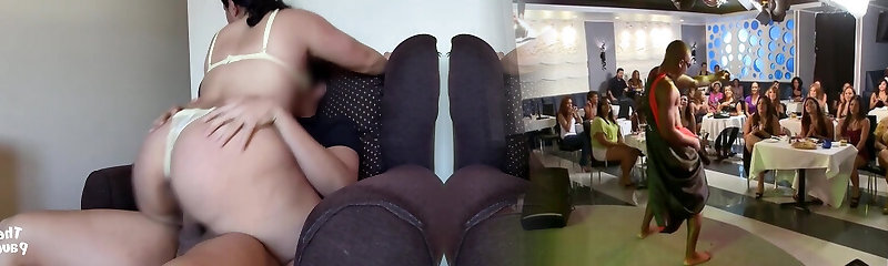 Round mature Lucca F sucks and rides trio different cocks. HD