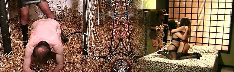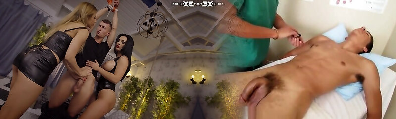 two sex-starved mistresses penetrate one tied up dude with a big beefstick