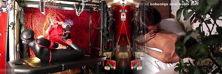 Kinky blond mistress London River makes her masculine slave cum in bondage