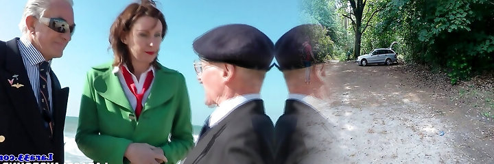 Stockings milf in threeway facialized by old guys