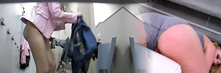 Super-cute amateur gal in blue jeans filmed in the public restroom