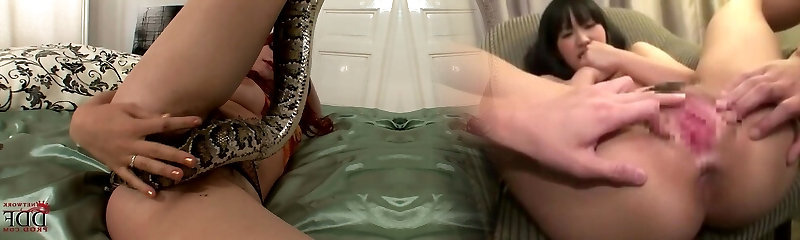 Long snake wriggles along cuddly figure of red-haired slut