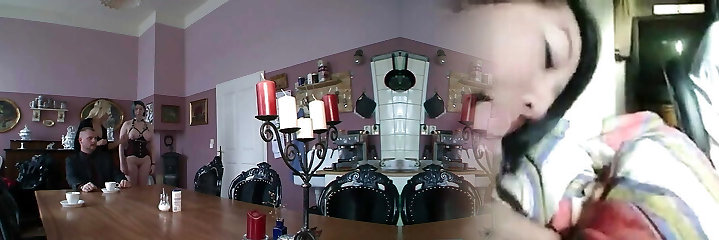 великолепная дымящаяся блондинка-горничная на коленях у властной темноволосой милфы