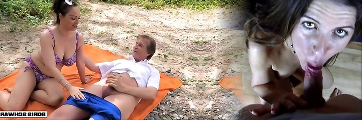 мамочка-нудистка сосет короткую писечку пухлого папочки на пляже