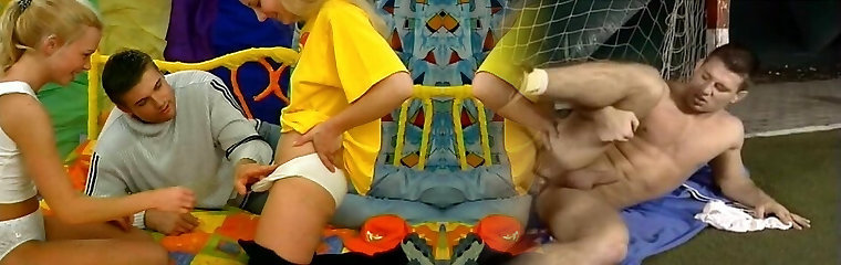 горячие блондинки-фанатки наслаждаются сексом втроем с волосатым парнем