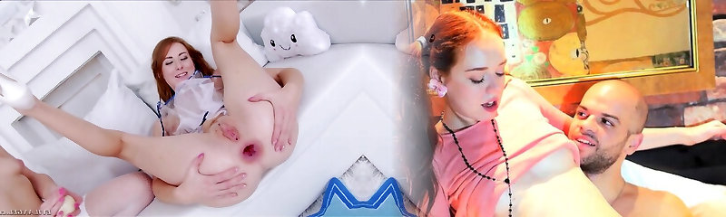 рыжеволосый подросток оливия широко открыл ее пун с гигантским дилдо