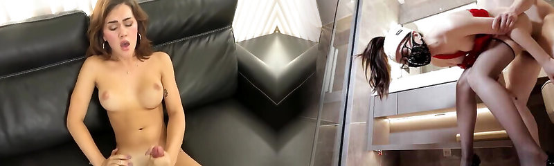 Sexy shamale chick with small dick satisfies smooth-shaven headed dude
