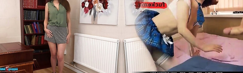 Exhilarated young stepsis with a mind-blowing body rubs her smoothly-shaven muff on the table and has an orgasm