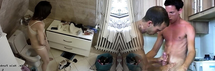 Slender white brown-haired teen with lean as filmed from above in the toilet