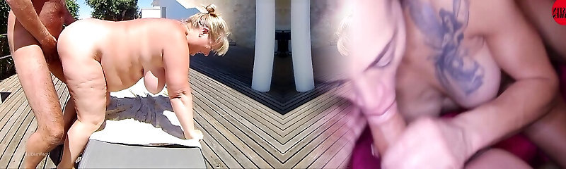 Ugly blond fatso Andrea satiates two fresh and hot dicks